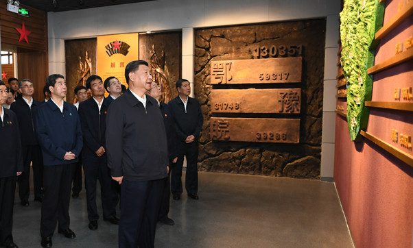 接着,习近平来到鄂豫皖苏区首府革命博物馆,了解鄂豫皖苏区的革命历史。鄂豫皖苏区是中国共产党在土地革命战争时期领导创建的根据地之一,是仅次于中央苏区的第二大革命根据地,诞生了多支红军主力,创造了“28年红旗不倒”的奇迹。解放战争时期,这里是刘邓大军千里挺进大别山的落脚地。博物馆展陈了许多珍贵的革命文物,习近平驻足察看,不时同大家交流,追忆峥嵘岁月。习近平强调,开展“不忘初心、牢记使命”主题教育,党员、干部要多学党史、新中国史,自觉接受红色传统教育,常学常新,不断感悟,巩固和升华理想信念。革命博物馆、纪念馆、党史馆、烈士陵园等是党和国家红色基因库。要讲好党的故事、革命的故事、根据地的故事、英雄和烈士的故事,加强革命传统教育、爱国主义教育、青少年思想道德教育,把红色基因传承好,确保红色江山永不变色。